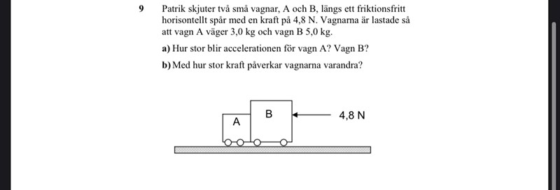 Patrik skjuter två små vagnar, A och B, längs ett friktionsfritt horisontellt spår med en kraft på 4,8 N. Vagnarna är lastade så att vagn A väger 3,0 kg och vagn B 5,0 kg.
