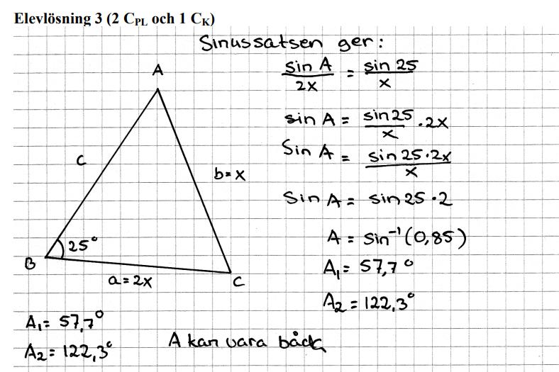 Jag löser den på samma sätt som den här elevlösningen men får endast att A=57.7, vart kommer 122.3 ifrån? för att få alla poäng i frågan måste man skriva båda svaret.