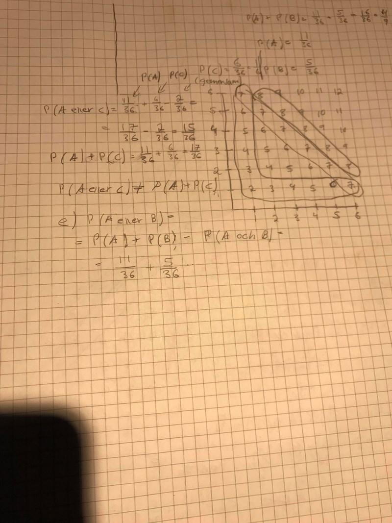 Nästan längst ner skriver du P(A eller C) P(A och C), men det verkar som om du menar att högerledet skall vara P(A)+P(C), eftersom du räknar ut det till 17/36. Sannolikheten P(A och C) betyder sannolikheten att A och C inträffar samtidigt och har alltså värdet 2/36.