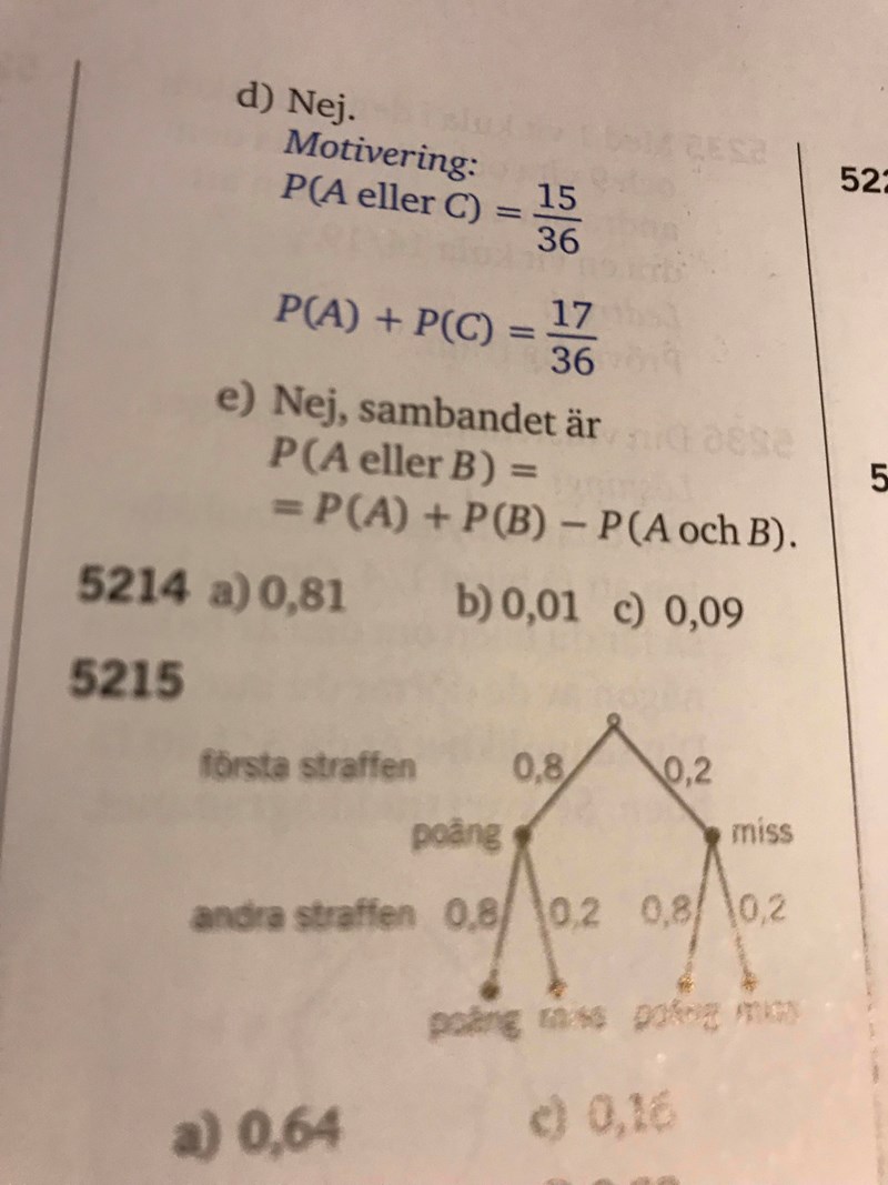 Men jag får inte ihop facits beräkning. De har variablerna A och B, och skulle man beräkna som de gör enligt händelse A och B som står i uppgiften, blir utfallet: P (A eller B) = P (A) + P (B) - P ( A och B) = , men de har inga gemensamma åtminstone en etta och poängsumma 8, när man avläser rad samt kolumn.