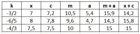 Tredje raden med x = 7,5 visar att m + a blir lika med x + c