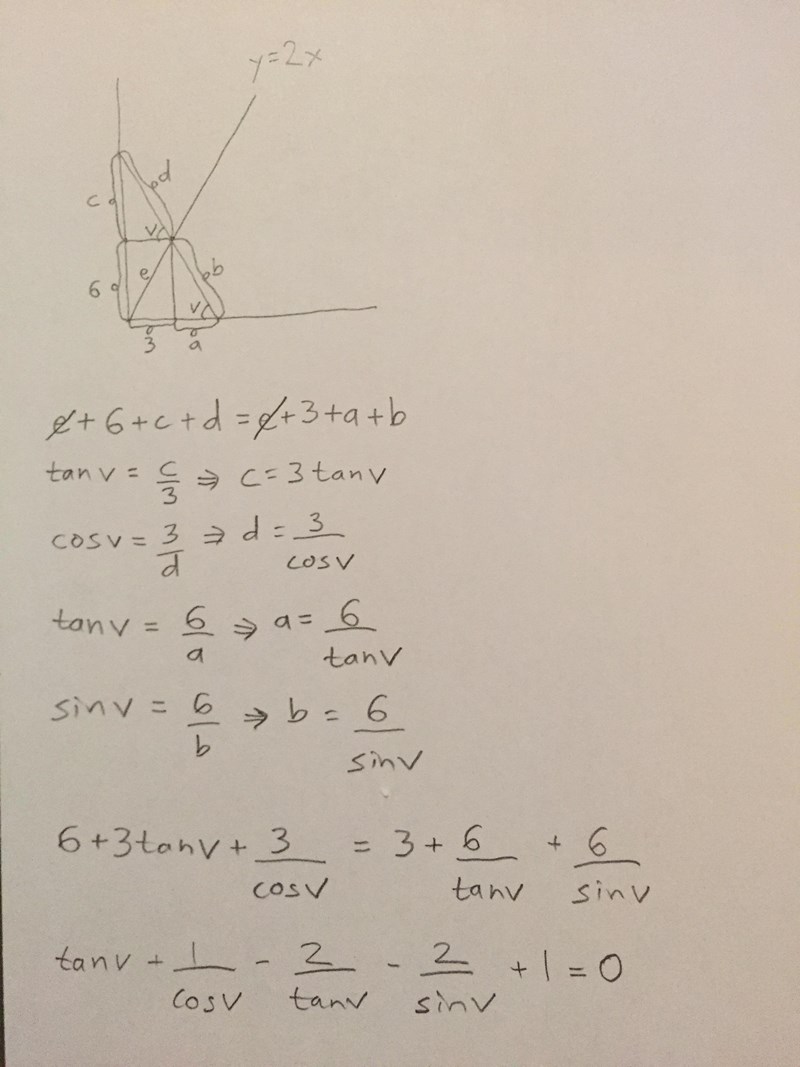 Ett alternativ är att kalla den övre vinkeln i den stora triangeln för . Då kan man uttrycka trianglarnas sidlängder genom olika samband med denna vinkel. Blir dock inte helt smidig ekvation där heller...