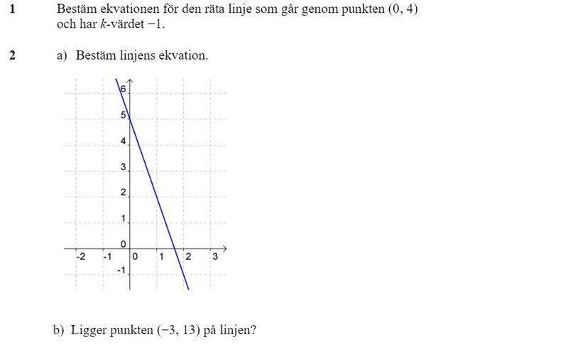 Angående första frågan: En rät linje kan skrivas på formen . Prova att sätta in de värden du har. Vad får du? :)