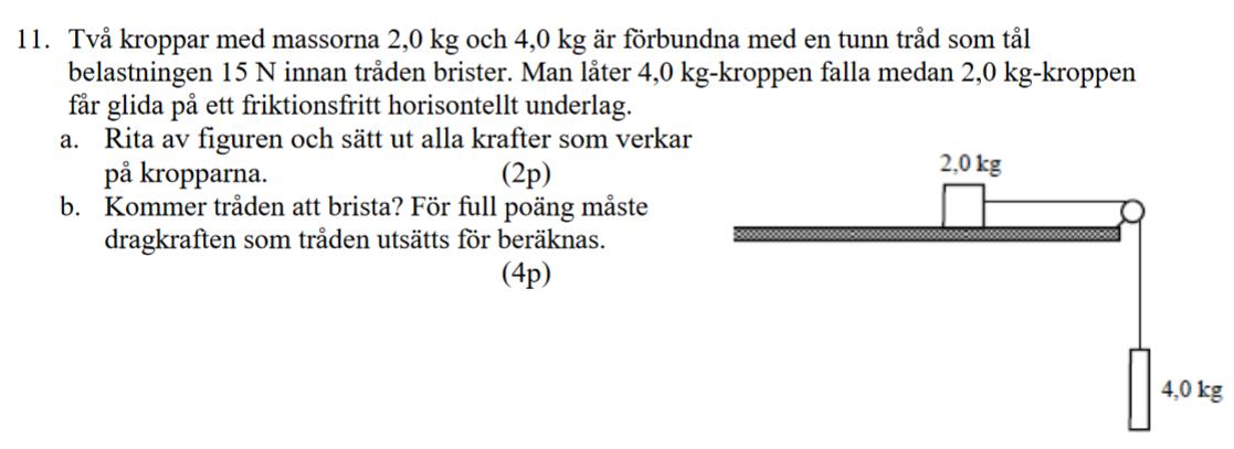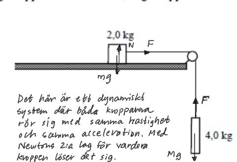 Jag vet från a) att spännkraften är lika stor från den lättare vikten som spännkraften från den tyngre. Vill ta reda på accelerationen för båda vikterna men förstår inte hur jag ska tackla uppgiften. Är det endast spännkraften från den tyngre vikten som påverkar den resulterande kraften nedåt? Fres = ma, där Fres = Ft2 - Fs (om Ft2 är för den tyngre)? Men eftersom det är två vikter som accelereras, måste jag lägga ihop dem? Jag är lost.