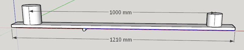 Skulle det bli enklare att räkna med en enda kraft från mitten av brädan? Den tanken har inte slagit mej förrän nu. Den kraften verkar i så fall i mitten (605mm från kanten) med massan 895g.