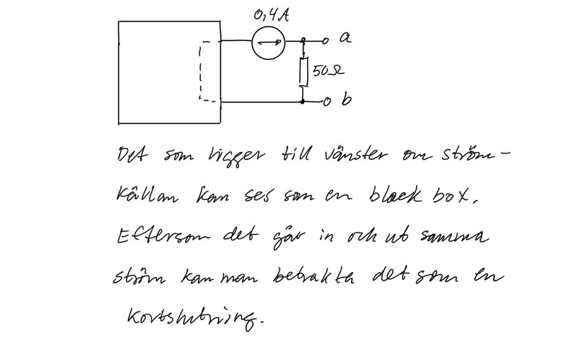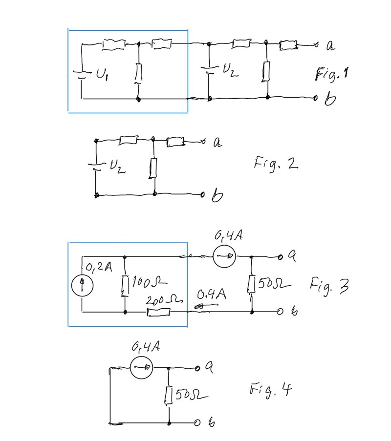 På liknande sätt (fast omvänt) är det med din krets avseende strömkällan 0,4 A (fig. 3). Det går 0,4 A in i och ut ur den inramade delen. Om man inte vill ha med den delen ersätts den med en kortslutning och du får en ekvivalent krets (fig. 4). Det som då ändras gentemot ursprungskretsen är att spänningen över strömkällan ändras (men den efterfrågas sällan) och det påverkar inte den ekvivalenta kretsen i övrigt.