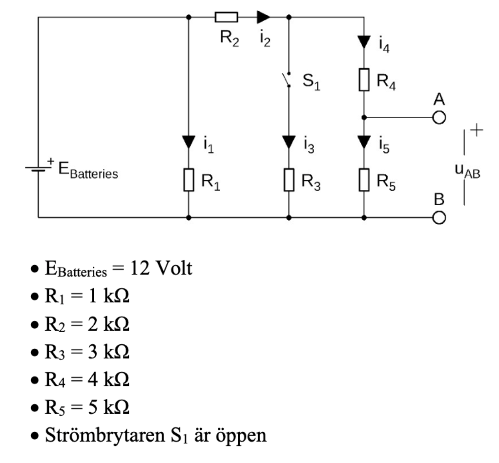 Resistansen R1 ligger parallellt med spänningskällan E, vilket innebär att i1 är helt oberoende av de andra strömmarna i2 - i5.