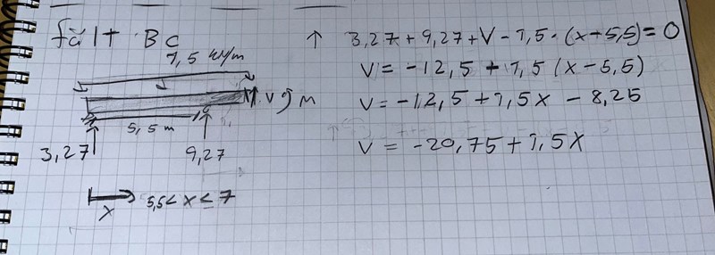 Hej! Lyckas inte lösa rätt tvärkraft i snittet. Är min ekvation för tvärkraften korrekt? Tänker jag fel?