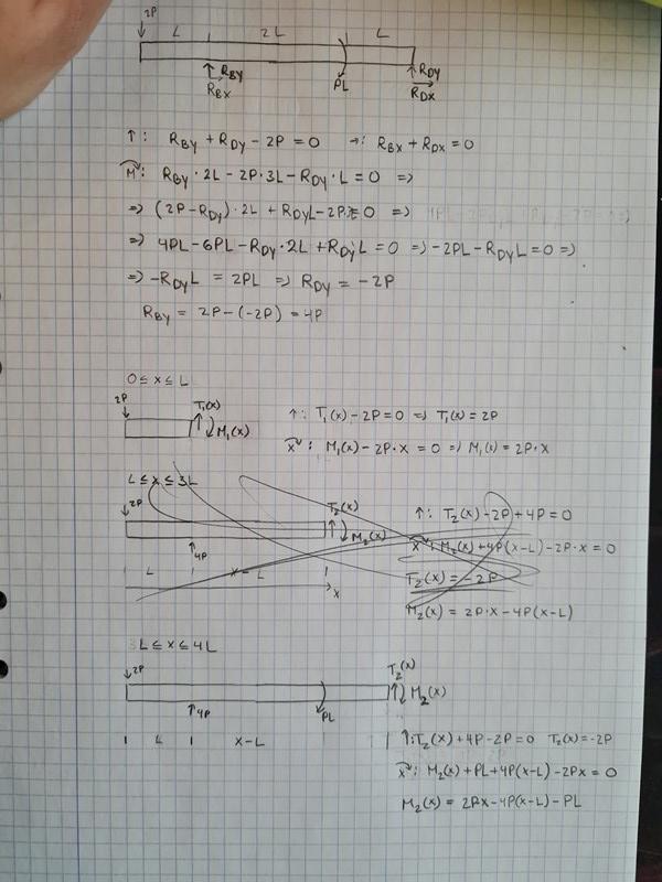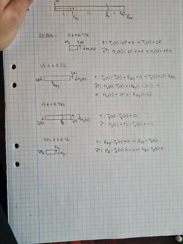 Jag insåg att jag har fått fel på reaktionskrafter och råkar räkna fel pågrund att jag glömde ändra en minus tecken, jag lyckades få M3(4L) = 0, enligt min diagram för moment så faller från 3L ner ett steg men den går hela vägen till noll sen. De mest för man har en moment på punkten 3L ? jag snittade 0 till L, L till 3L och 3L till 4L. Annars min tvärkraft diagram från L till 4L är konstant med samma kraft