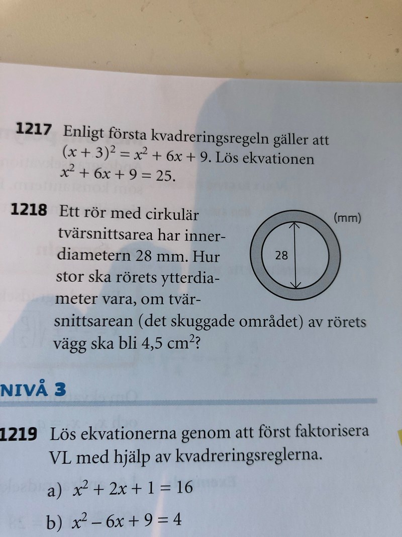 Jag skulle kalla ytterradien för r och ställa upp att det skuggade områdets area är πr2-π·142\pi r^2 - \pi\cdot 14^2.