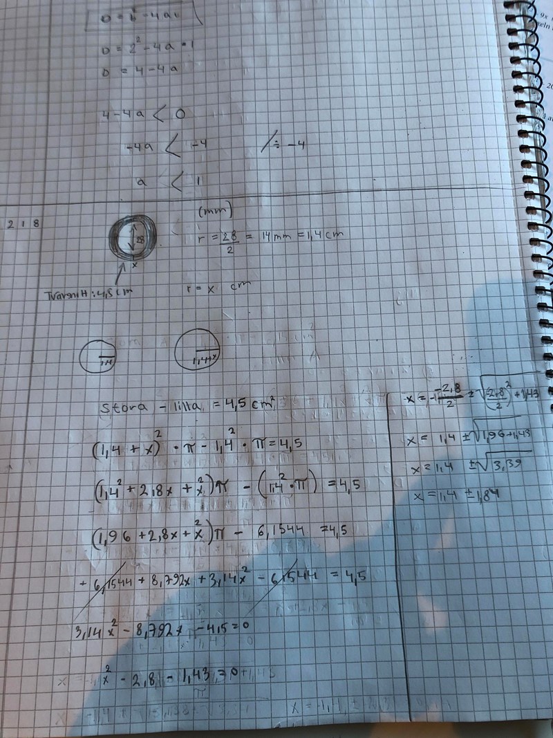 Du har satt upp följande ekvation rätt: (1,4+x)2·π-1,42·π=4,5