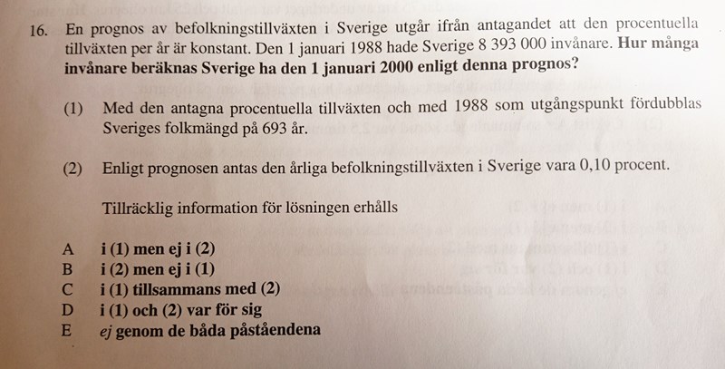 SvanteR skrev :Men i frågan står det ju att antagandet är att den procentuella tillväxten per år är konstant. Så det är ju givet. Eller missförstår jag din fråga nu?