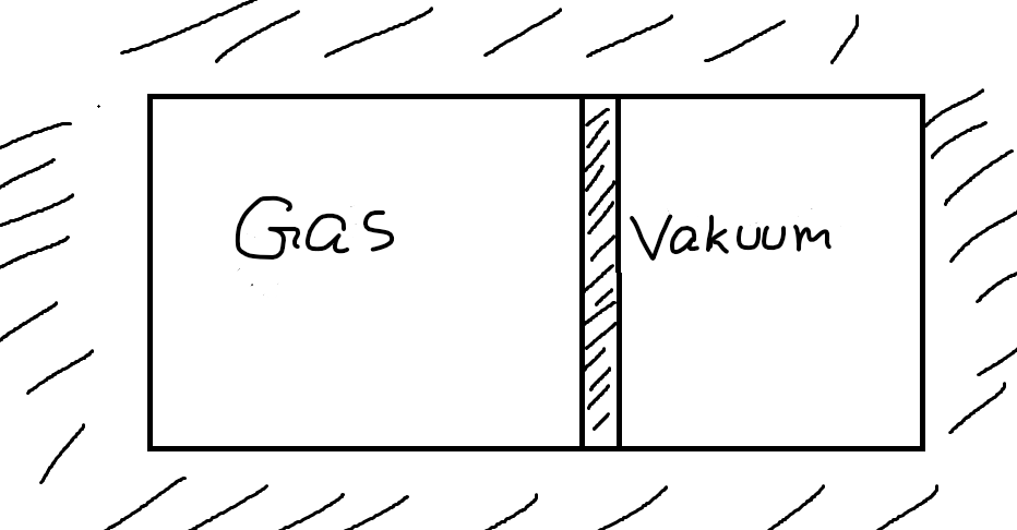 Vi kan tänka oss att vi flyttar kolven instant en bit åt höger till en slutvolym . Då kommer gasen turbulent expandera mot det vakuum som blottas och till slut kommer en ny jämvikt inrätta sig. Låt säga att vi nu istället låter gasen expandera kvasistatiskt mot vakuum till samma slutvolym . Då gäller: