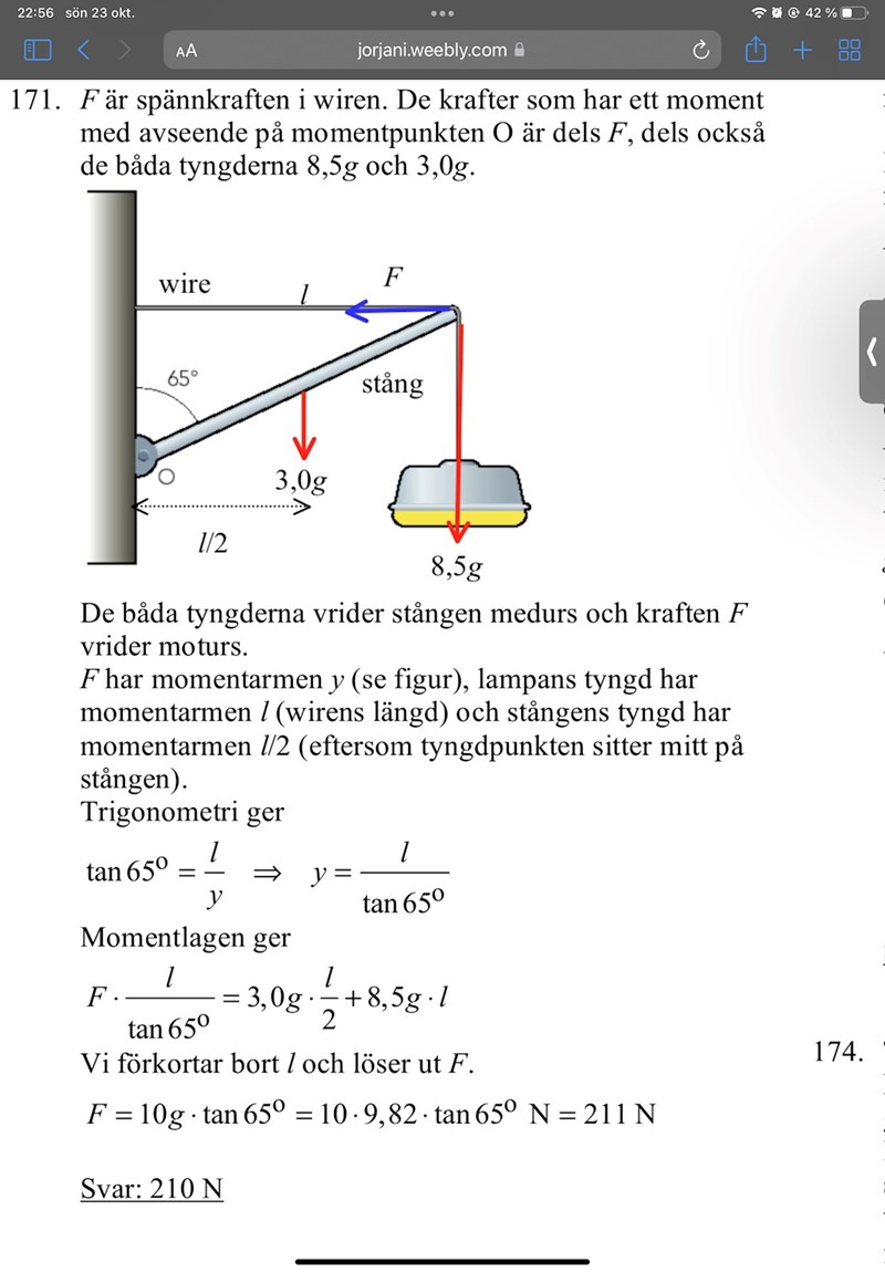 jag ser det. Men min fråga är borde inte l/2 vara sin65*l/2 istället eftersom stången lutar.