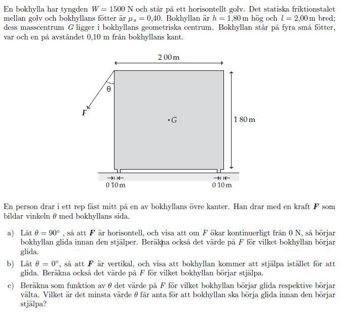c) Beräkna som funktion av θ det värde på F för vilket bokhyllan börjar glida respektive stjälpa, vilket är det minsta värde θ får anta för att bokhyllan ska börja glida innan den börjar stjälpa.