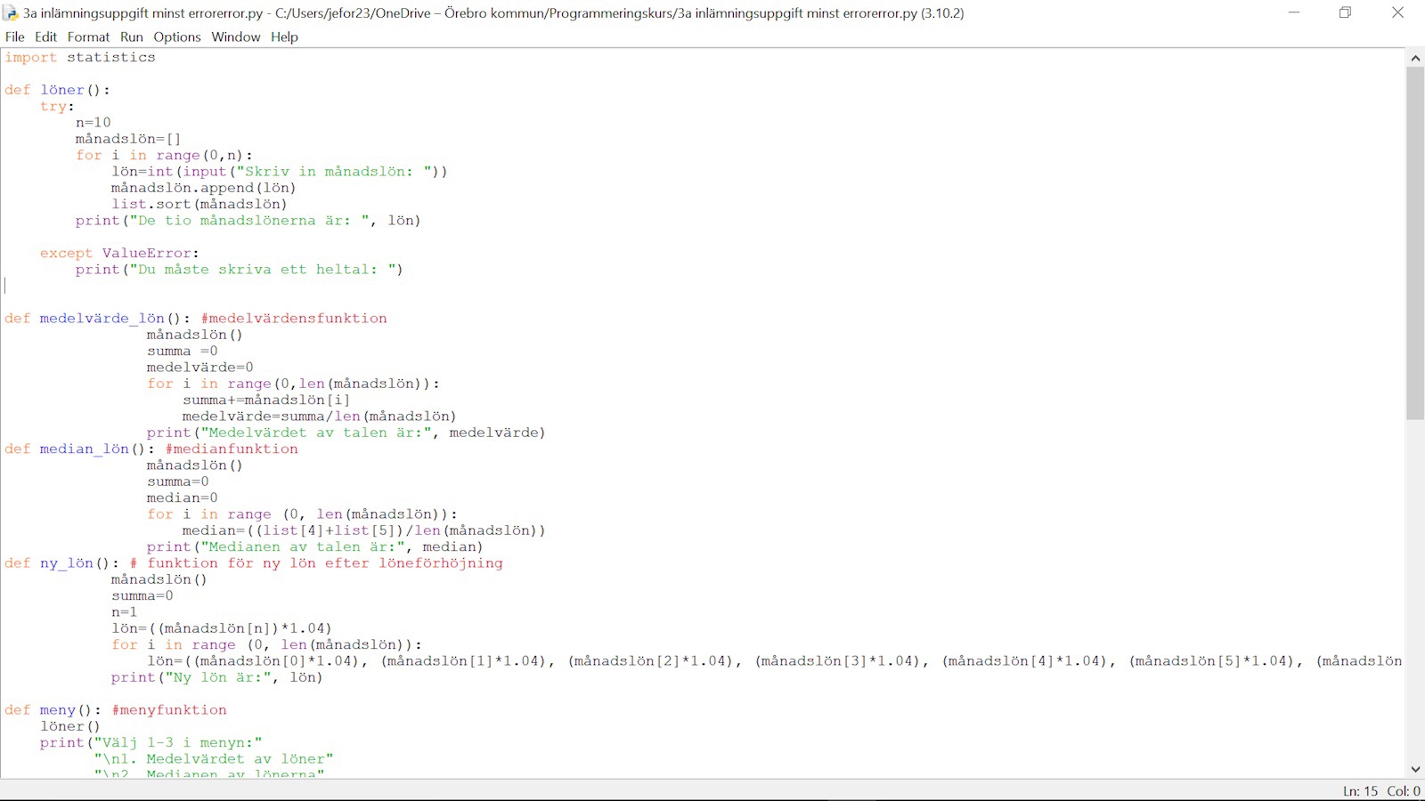 I löner definierar du månadslön som en vektor och fyller den. Det är en lokal variabel som bara är tillgänglig i den den funktionen. När du använder samma identifierare i de andra funktionerna så är det nya variabler som skapas i de funktionerna men som då inte har några värden. Flytta ut månadslön=[] till global scope, dvs direkt efter import statistics så är den tillgänglig i alla funktioner.