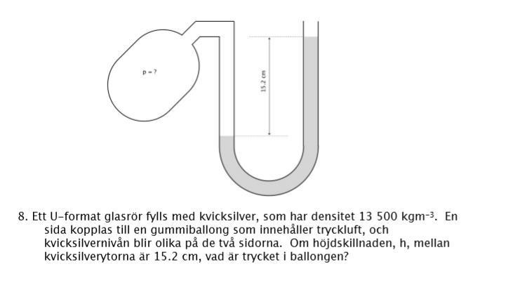 Om trycket i gummiballongen hade varit lika med lufttrycket skulle kvicksilverytorna stå på samma höjd i båda benen. Nu motsvarar trycket i ballongen luftttrycket + trycket från en 15,2 cm hög kvicksilverpelare. Du skall räkna fram trycket i ballonen i SI-enheten pascal (Pa) där 1 Pa=1N/m2. Kommer du vidare härifrån? Fråga mer annars!