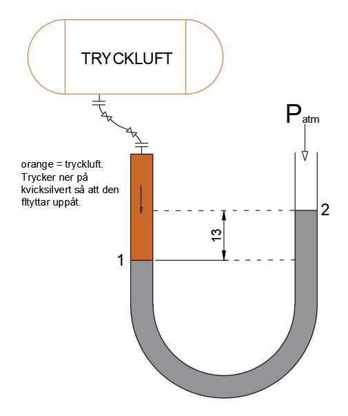 Vi ser att det blir en höjdskillnad på 13 cm (i ditt fall 15.2 cm) mellan punkt 1 och 2. Denna höjdskillnad/pelare jobbar MOT tryckluften liksom atmosfärstrycket på höger öppning. Med andra ord trycker tryckluften mot pelaren och atmosfärstrycket.