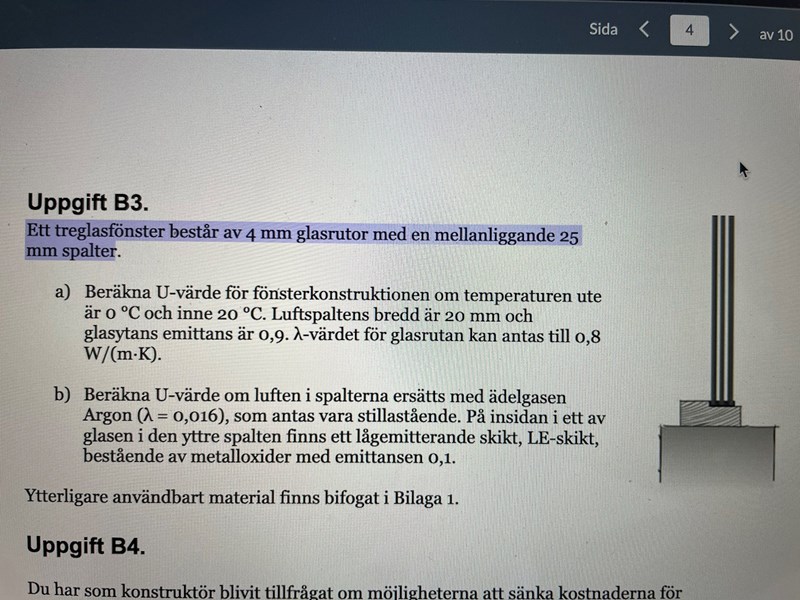 Man har också angett glasytans emittens och då får jag anta att uppgiftskonstruktören har menat att du även ska ta hänsyn till den värmetransport som sker genom strålning (Stefan-Bolzmans lag) och ska man va petig så blir det strålning till och från alla glasytor (6 st) och motsående medium/yta. Där man kan förenkla och bara ta hänsyn till strålningen till och från ytterytorna. För att göra det måste man räkna ut temperaturen på de ytorna och det kan kräva en del iterationer. Eftersom det står i uppgift b att det är ett metalloxidskikt på insidan av det yttre glaset så behöver du titta på strålning mellan alla glasen och du behöver anta en temperatur i varje glas och beräkna ledning och strålning med hjälpa av den. Det blir ett ekvationssystem som ska lösas gissar jag.