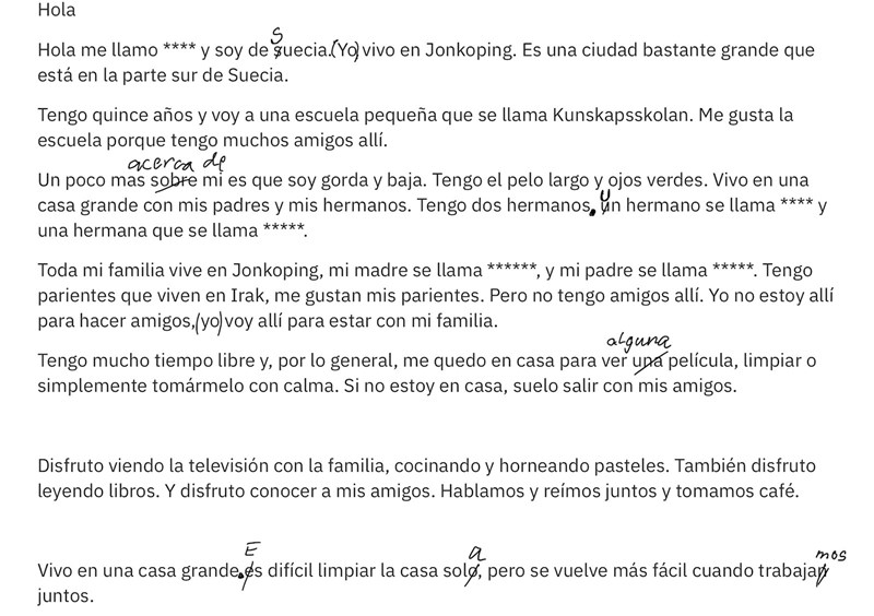 Toda mi familia vive en Jonkoping, mi madre se llama ******, y mi padre se llama *****. Tengo parientes que viven en Irak, me gustan mis parientes. Pero no tengo amigos allí. Yo no estoy allí para hacer amigos, yo voy allí para estar con mi familia.