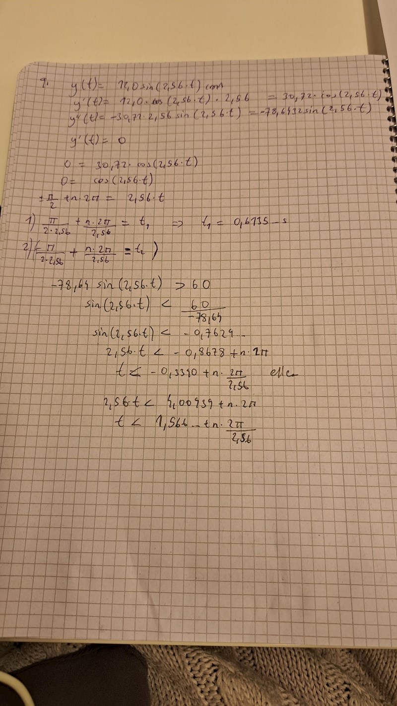 y''(t) > 60 ger nu -2,562*12*sin(2,56t) > 60, vilket i sin tur ger sin(2,56t) < -5/2,562