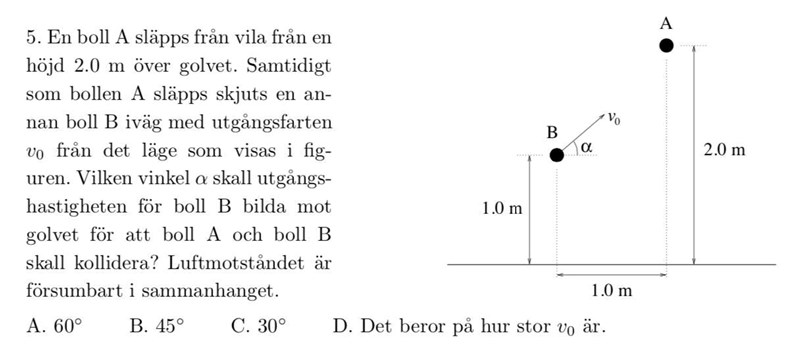 Alternativ D är korrekt i det fall en av bollarna studsar i marken innan de kolliderar. Om man tänkar att boll B studsar i marken vid någon tidpunkt, så kommer den att få en ny hastighet där y-komponenten av dess hastighet i punkten där den träffar marken byter tecken, och vinkeln den då har bestäms av förhållandet mellan (tangens för vinkeln är lika med förhållandet mellan) bollens hastighet i y- och x-led. Man kan också se den här bilden -- om man studsar en boll (förlustfritt, för enkelhets skull) så är perioden för bollens studs 2v/g där v är hastigheten då den studsar. Man har också mgh (vid högsta punkt för studsen) lika med som är hastigheten då bollen möter marken. Så perioden är också . Det räcker att inse att den högsta höjd bollen når (som alltså bestämmer periodtiden för studsen) beror på både vinkel och hastighet, och bollarna studsar då med olika period - det är inte ett exakt bevis, men det bör göra att man misstänker att för varje studsperiod man vill hitta en kollision mellan bollarna så kommer den att bero kritiskt på hur mycket fart bollen får i x-led vid utgångspunkten i relation till farten den får i y-led, och farten i y-led bestämmer perioden för studsen på boll B.