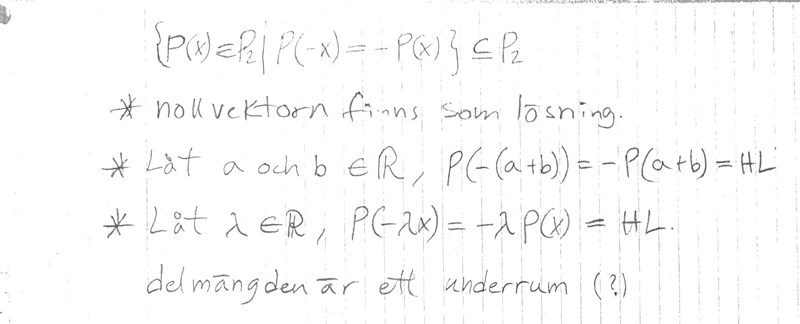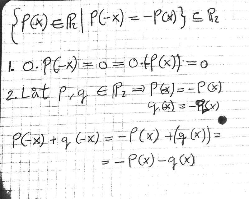 2. Din mängd är inte lika med P2\mathbb{P}_2 utan snarare en delmängd (MM) till P2.\mathbb{P}_2. Du väljer två polynomfunktioner PP och QQ från denna delmängd och studerar polynomfunktionen P+QP+Q, som ju är en polynomfunktion i P2\mathbb{P}_2 eller hur? Du är intresserad av att undersöka talet (P+Q)(-x)(P+Q)(-x) och se om det är lika med talet -(P+Q)(x).-(P+Q)(x).