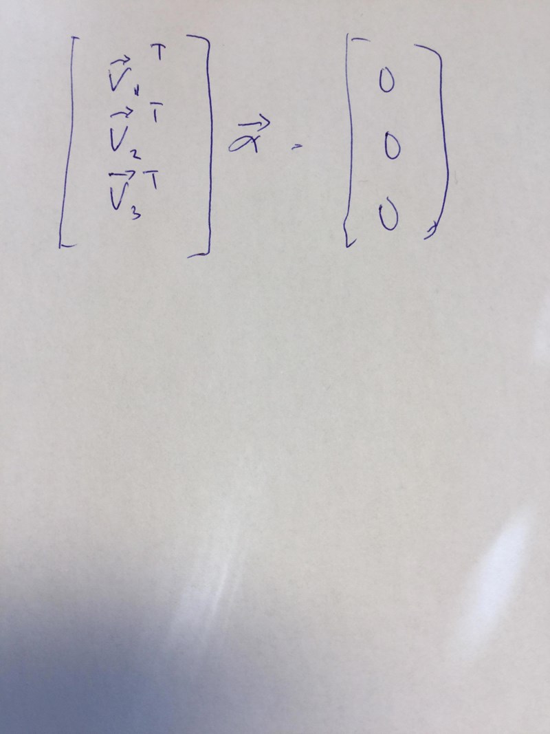 Så problemet kan formuleras om så att vi vill hitta en nollskild vektor α sådan att αTvi = 0, i = 1, 2, 3. Detta kan skrivas som en enda matrisekvation enligt