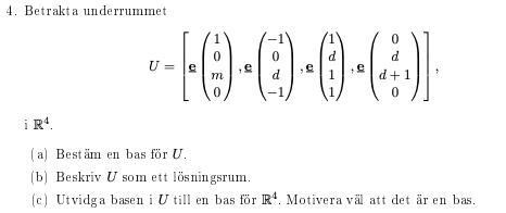 EDIT: Glömde nämna att jag gått vidare från a). Tillsatte variablerna m samt d i de första 3 vektorerna, efter att ha konstaterat att de var linjärt oberoende, och fick en bas (1,0,1,0),(0,0,-1,-1),(0,-1,1,1) för den som är nyfiken.