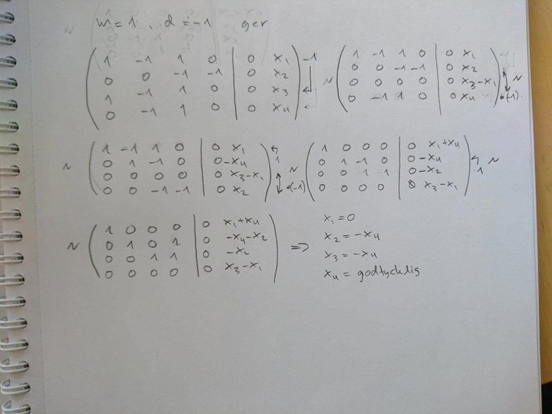 Du hittar enkelt uttryck för villkor genom att lösa totalmatrisen för en nollskild vektor x¯=(x1,x2,x3,x4)T\mathbf{\bar{x}}=(x_1, x_2, x_3, x_4)^T. Det gör du på samma sätt som du gjorde då du löste beroendeekvationen (fast då löste du för vektorn 0\mathbf{0}).