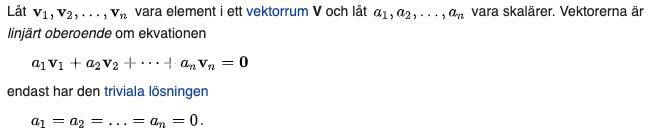 Ett alternativ är att göra det rekursivt (men gör som du tänkt, inget fel med det). Kolla först om den andra vektorn kan skrivas som en linjärkombination av den första vektorn; om inte, så är den första och den andra vektorn linjärt oberoende. Om den första och den andra vektorn är linjärt oberoende, kolla om den tredje vektorn kan skrivas som en linjärkombination av den första och den andra vektorn; om inte, så är de tre första vektorerna linjärt oberoende.