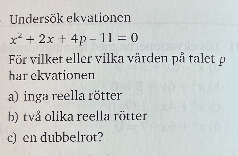 Jag håller på med denna uppgift som du kan se nedan. Det jag vet är att diskriminanten i pq-formeln ska bli negativ för a), i b) så ska diskriminanten vara större än 0 och i c) så ska diskriminanten vara = 0. Men det jag inte vet är hur jag ska gå tillväga för att ta reda på vad p är. Jag vet inte hur jag ska ställa upp ekvationen så att den ser ut så här: x2 + px + q = 0, och skulle verkligen uppskatta om någon skulle vilja hjälpa mig med det.