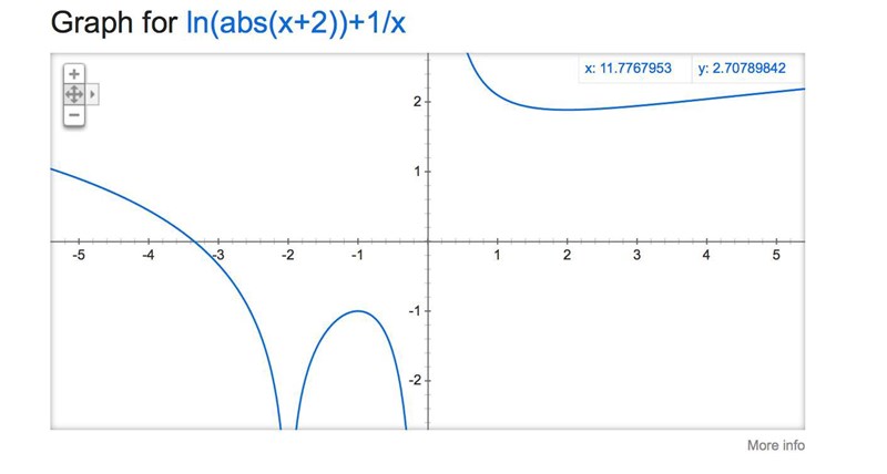 Kolla först vad som händer med den första termen. Den är lite som en tratt -- växer långsamt vid stora och små x och går snabbt mot stora negativa tal när den närmar sig -2. Det är tydligt att den har två lösningar för vilket k som helst, och för tillräckligt stora x kommer den att dominera den andra termen. Den andra termen kommer smygande under x-linjen från vänster och dyker ner mot y-axeln och sen kommer den ner uppifrån till höger om y-axeln och närmar sig x-axeln uppifrån. Den termen ensam har exakt en lösning för alla k utom 0, då den inte har någon lösning. Tillsammans får de två termerna en bubbla i tredje kvadranten mellan x värdena -2 och 0 strax under y-axeln, och det är för det värde på k som ekvationen får tre lösningar.