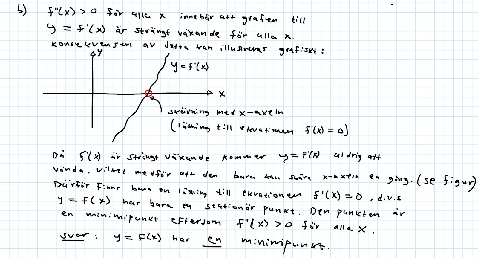 Alla villkor är uppfyllda vilket måste betyda att grafen y = f'(x) korsar x-axeln en gång. Det betyder att y = f(x) har exakt en extrempunkt och det är en minimipunkt i enlighet med det första villkoret (f''(x)>0 för alla x).