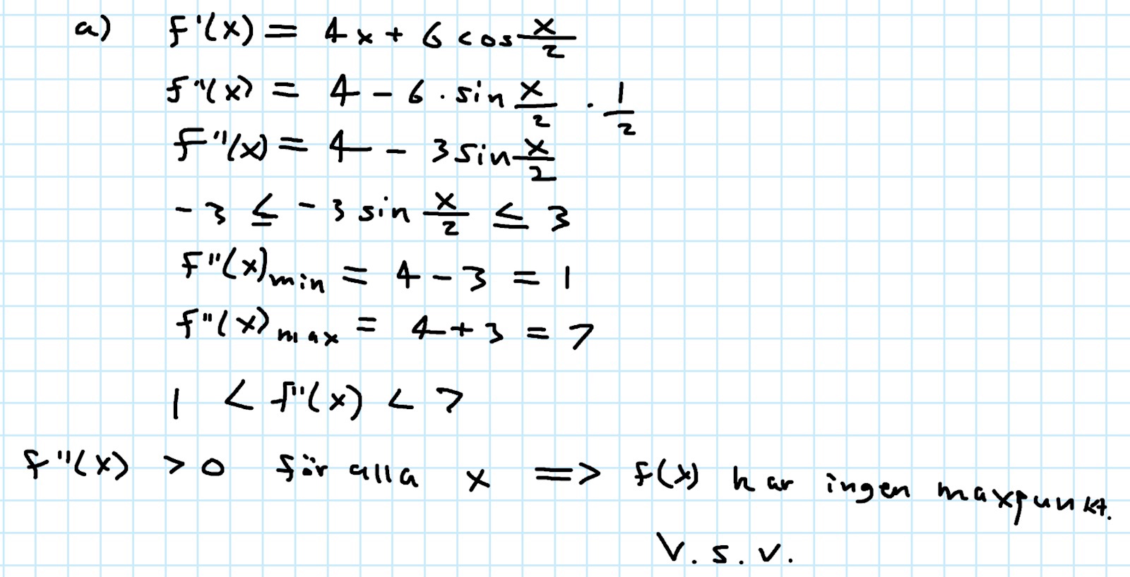 Jag behöver lite hjälp med b-uppgiften. Denna uppgift kommer från ett gammalt nationellt prov och ja, jag har läst igenom lösningsförslaget. De blandar in gränsvärden och grejer, men varför göra det så komplicerat? Jag har försökt lösa den med derivata, men skulle behöva veta om min lösning är korrekt.
