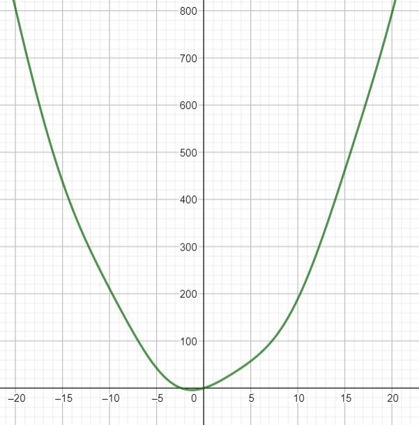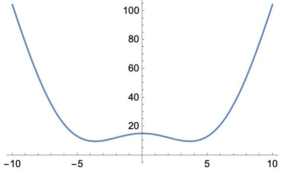 Därför kan f(x) approximeras: . Gränsvärdet innebär att f(x) går mot oändligt stora y-värden dels när x blir stort negativt och stort positivt. Det måste betyda att f(x) vänder någon eller några gånger, d.v.s. det finns en- eller flera minimipunkter.