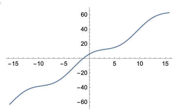 Deras motivering är bristfällig IMO. Eleven glömmer att motivera med att sinus är en udda funktion och att koefficienterna är gynnsamt valda, annars går det att skapa en funktion med fler än 1 minimum som ändå är "x^2-lik". Det räcker inte att säga att kurvan "i stort är x^2" och därmed har en (1) vändpunkt, vilket ses nedan.