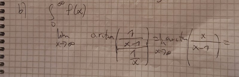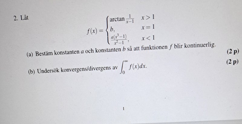 Hur menar du nu? Jag missade att istället titta på gränsen från 2 till inf eftersom x=1 är ej definierad inom argumentet för arctan funktion. Men får man göra som jag gjorde ? Jag förstår fortfarande ej varför facit fokuserar på arctan och ej de övriga då detta är en styckvis funktion? Sen säger du att vi hade behövt studera återstående intervall om funktionen hade konvergerat,vilka intervall?