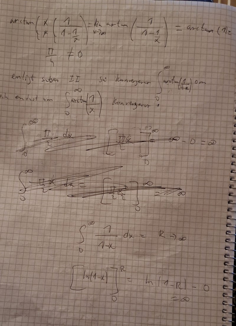 Facit använde en annan g(x) att jämföra med men jag undrar om mitt val av g(x) är gitligt också? Jag insåg att både (1/1-x) och 1/x divergerar, fast facit fokuserade enbart på 1/1-x och ej 1/x vilket jag ej ser varför. Vi har dessutom olika gränser där de tar 5 till inf medan jag använde 0 till inf, spelar det roll? De har inte heller tittat på de övriga funktioner som b och a(x^3-1)/(x^2-1) för att avgöra konvergens /divergens utan enbart arctan funktionen. f(x) består ju av alla de ?