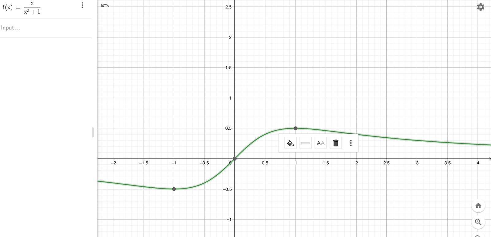 * Även när du kommit fram till att dessa punkter faktiskt är max- och minpunkter så visar derivataresonemanget bara att de är lokala extrempunkter. Det behöver inte i sig innebära att kurvan överallt håller sig mellan dessa extremer, utan skulle genom ett kontinuitetsbrott kunna hoppa utanför dessa gränser. Därför bör du också, för att vara stringent, undersöka om kurvan gör ett sånt hopp genom att studera vad som händer där/om nämnaren är noll.
