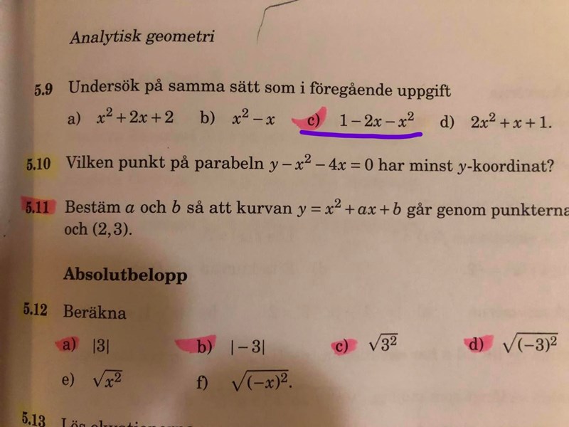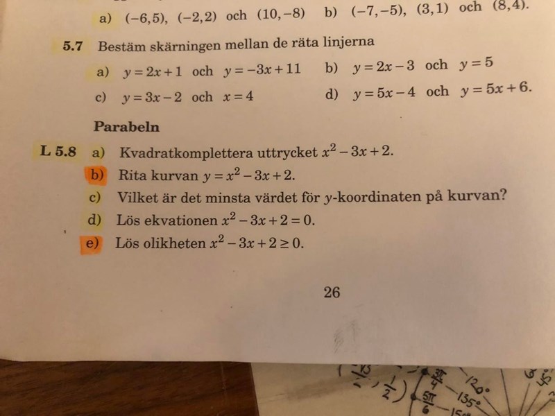 Uppgiften är, kvadratkomplettera, vilket är minsta(högsta) värdet för y-koordinaterna på kurvan, lös ekvationen, rita kurva, lös olikheten.