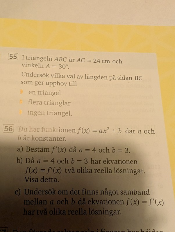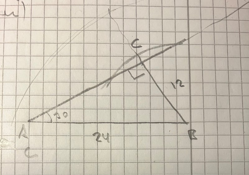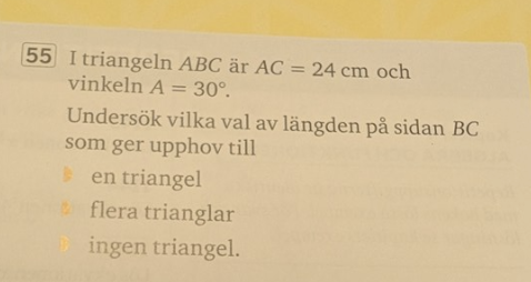 Då blir det ingen triangel om BC är kortare än 12, en triangel om BC är precis 12, två trianglar om 12<BC24 och en triangel om BC > 24.
