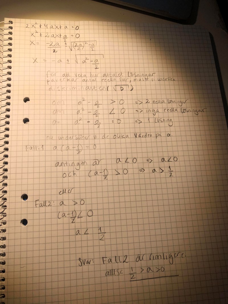 När du undersöker antalet oreella lösningar skriver du att svaret är att.  1/2 >  a> 0 . Hur kan det stämma? Om a är större än en halv då kommer summan av talen inuti parentesen att alltid vara + dvs det finns 2 lösningar. Om jag tex skriver 0,8-0,5=0,3. Jag får en positiv lösning. Det blir inget negativt svar.?  Jag förstår inte hur du kom framtill till att >1/2 >a>0varför just större än 0?