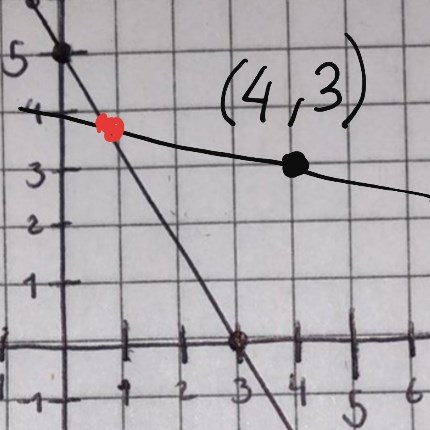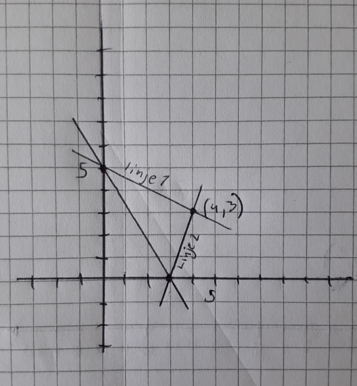 Den sista linjen uppfyller inte villkoret då den inte korsar den andra linjen alls. Linjen på bild nummer 2 verkar enklast att använda sig utav i detta fall då punkten verkar ligga vid (2,5 , 1) medans punkten på linjen på den första bilden känns svårare att läsa av, Då den varken ligger på 3,5 eller 4 på y-axeln.