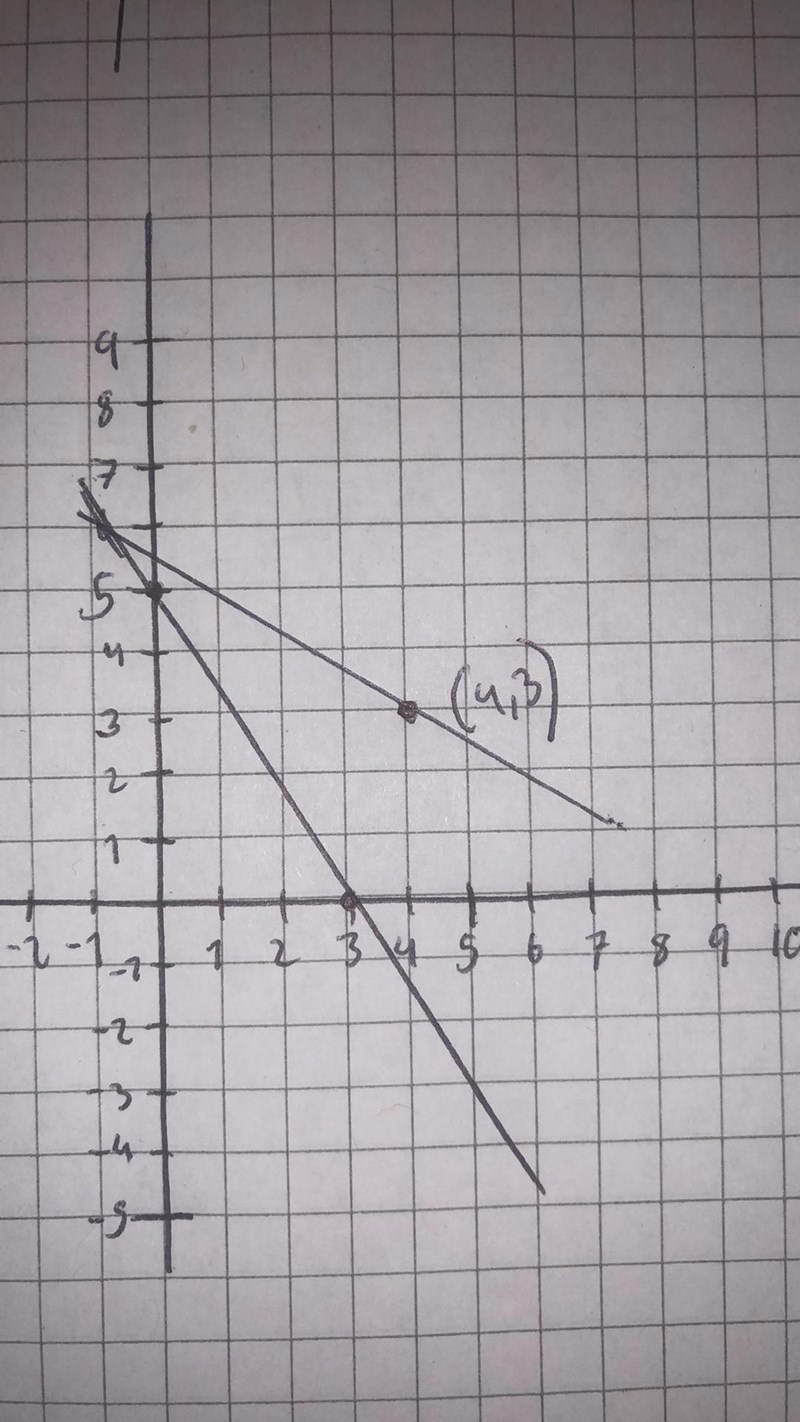 Här ritade jag två linjer från (4,3) punkten som är närmast det ''godkända området'', alltså precis på punkterna (0,5) och (3,0) Är det rätt?