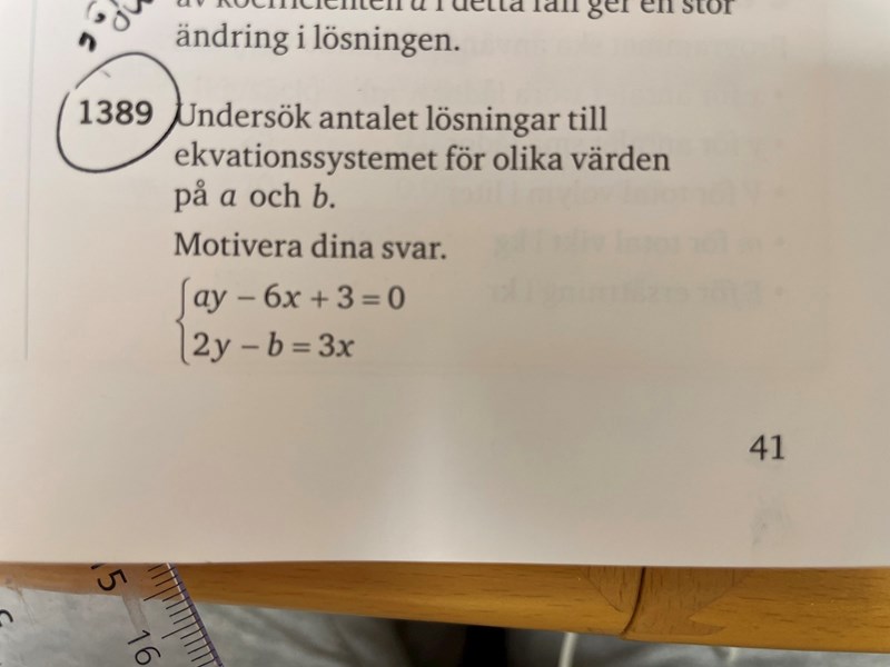 Och förstår att när 4=a så saknar lösning. Vad är värdet på b när ekvationssystemet saknar lösning?