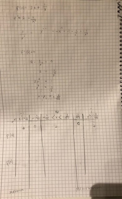 Observera att funktionen (och dess derivata) inte är definierad för x = 0 (det blir 0 i nämnaren). Ska man lösa den här uppgiften ordentligt (känns lite överkurs för matte 3?) måste man undersöka med hjälp av gränsvärden vad som händer då x närmar sig 0, både från vänster och från höger, samt vad som händer då x går mot . Den här funktionen kommer inte att ha ett största eller minsta värde, eftersom den kan bli oändligt stor eller oändligt negativ.
