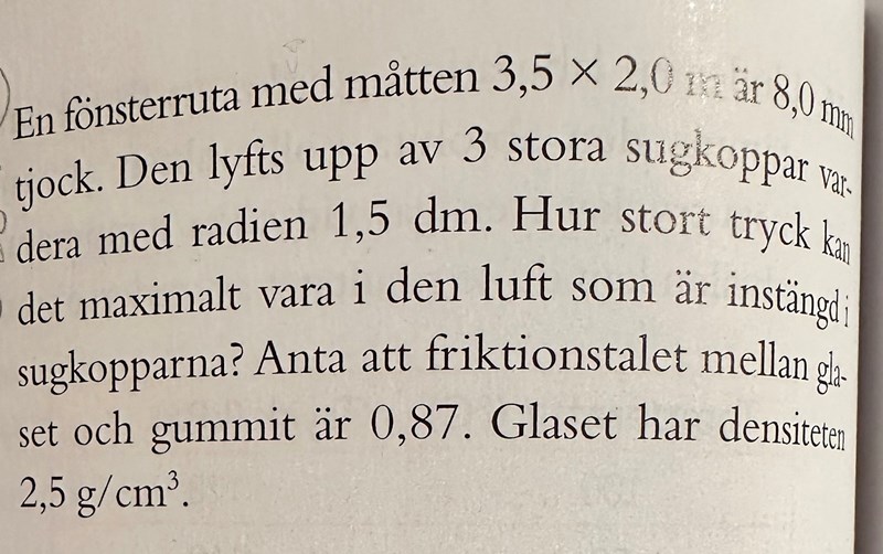 Dr. G skrev:Det är lufttrycket som trycker fast sugkoppen mot glaset. Den sitter då fast ifall trycket inne i sugkoppen ör lägre än det yttre trycket, pinne < pute. Nettoeffekten får du som skillnaden i yttre tryck och inre tryck (gånger tvärsnittsarean).