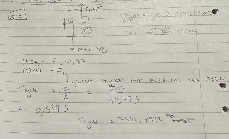 Fn är den kraften som trycker från väggen till sugkopparna och ut mot glaset. Alltså om man delar den med arean får vi trycket inuti sugkopparna och det blir 7.5kPa
