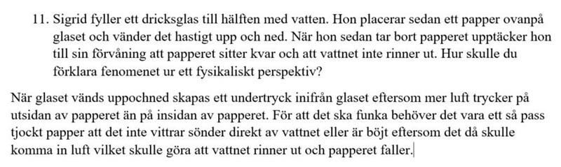 Men det finns inte bara vatten i glaset utan även luft. Så era svar är lite för enkla. Det yttre lufttrycket måste vara större än trycket från vattenpelaren plus lufttrycket inne i glaset. Varför är det så?